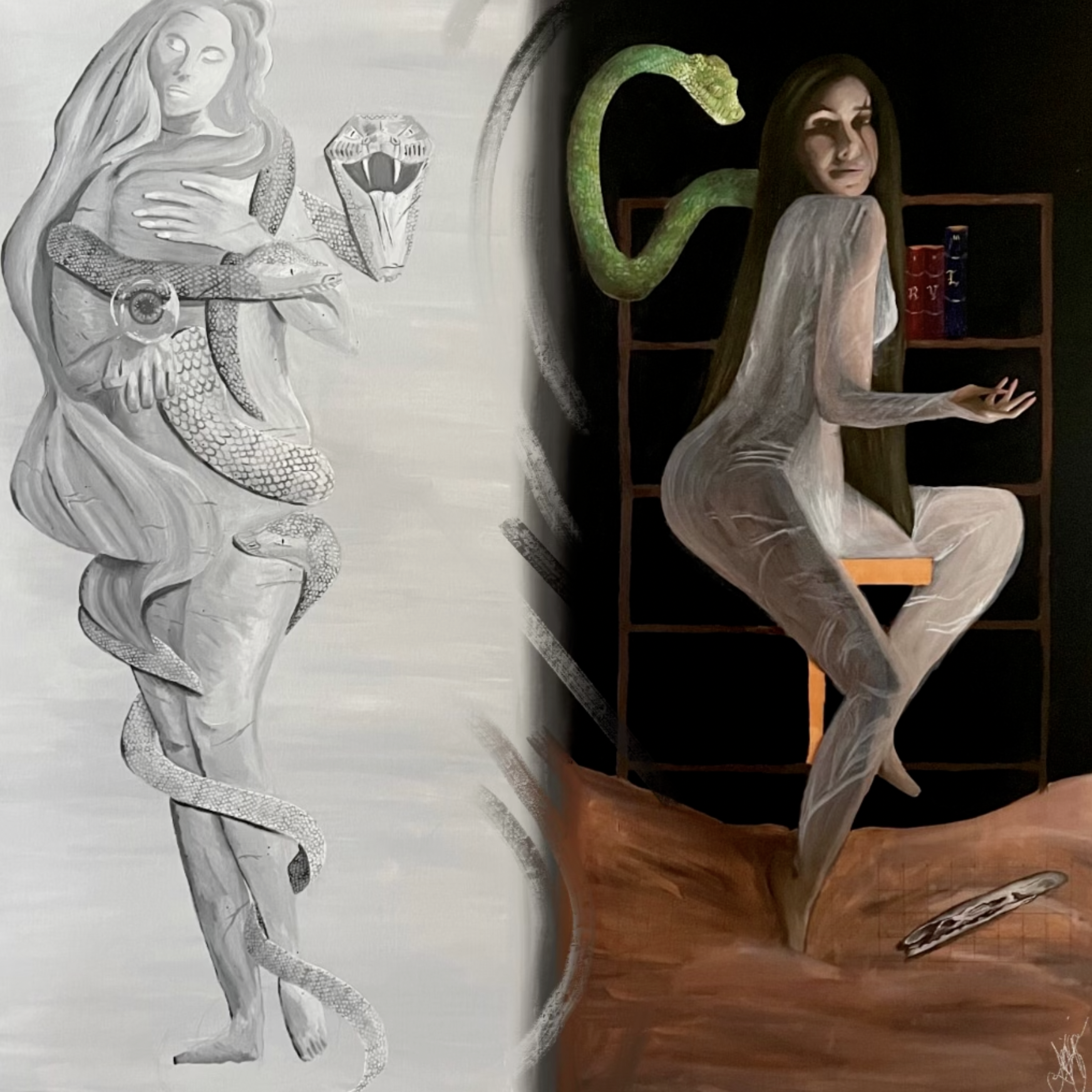 Eve as Venus depicts the transition from objectivity to subjectivity through the story of Eve. In her early stages, she's portrayed as a statue, carved and judged by spectators, though she holds an all-seeing eye as she observes silently. Her second stage is a work in progress as she emerges from the marble, but since she revives her soul, so too have her temptations resurrected. Eve emerges from her stone entrapment, as does her green-fiend temptation. She finds herself before three books, respectively engraved “R,” “V,” and “L.” Her outstretched hand welcomes the opportunity to hold a new truth, though her other hand remains hidden, signifying her hesitancy. The painting also contains an anamorphic skull, a subtle memento mori.