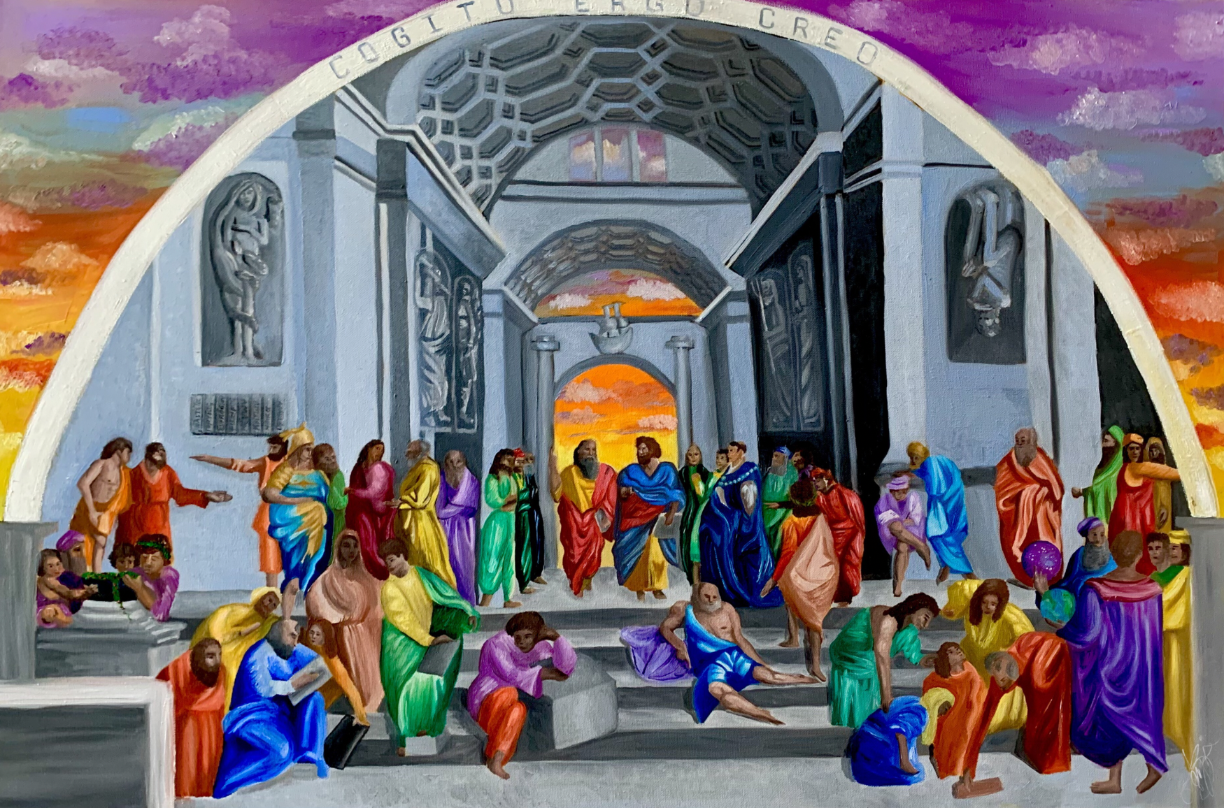 In this rendition of Raphael’s classic School of Athens, our beloved thinkers find themselves in a heavenly atrium, In the Clouds of Athens, reviving their love of wisdom and knowledge. Some new faces have arrived since its first debut in the 16th century. Above the room filled with enlightened thinkers is engraved “Cogito Ergo Creo,” which translates to “I think, therefore I create.”